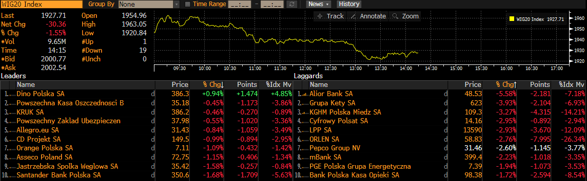Dino Polska jest jedyną z zyskujących firm wśród WIG20. Źródło: LP Bloomberg Financial