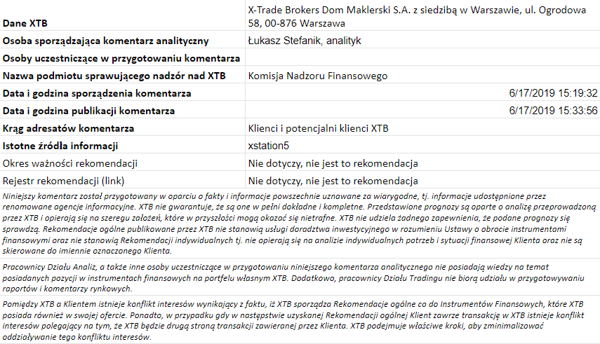 Ta publikacja handlowa jest informacyjna i edukacyjna. Nie jest rekomendacją inwestycyjną ani informacją rekomendującą lub sugerującą strategię inwestycyjną. W materiale nie sugerujemy żadnej strategii inwestycyjnej ani nie świadczymy usługi doradztwa inwestycyjnego. Materiał nie uwzględnia indywidualnej sytuacji finansowej, potrzeb i celów inwestycyjnych klienta. Nie jest też ofertą sprzedaży ani subskrypcji. Nie jest zaproszeniem do nabycia, reklamą ani promocją jakichkolwiek instrumentów finansowych. Publikację handlową przygotowaliśmy starannie i obiektywnie. Przedstawiamy stan faktyczny znany autorom w chwili tworzenia dokumentu. Nie umieszczamy w nim żadnych elementów oceniających. Informacje i badania oparte na historycznych danych lub wynikach oraz prognozy nie stanowią pewnego wskaźnika na przyszłość. Nie odpowiadamy za Twoje działania lub zaniechania, zwłaszcza za to, że zdecydujesz się nabyć lub zbyć instrumenty finansowe na podstawie informacji z tej publikacji handlowej. Nie odpowiadamy też za szkody, które mogą wynikać z bezpośredniego czy też pośredniego wykorzystania tych informacji. Inwestowanie jest ryzykowne. Inwestuj odpowiedzialnie.