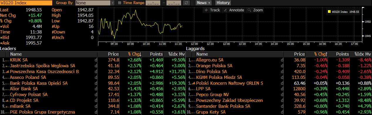 Asseco Poland (ASE.PL), PKO (PKO.PL), JSW (JSW.PL) oraz Kruk (KRU.PL) przewodzą wzrostom WIG20
