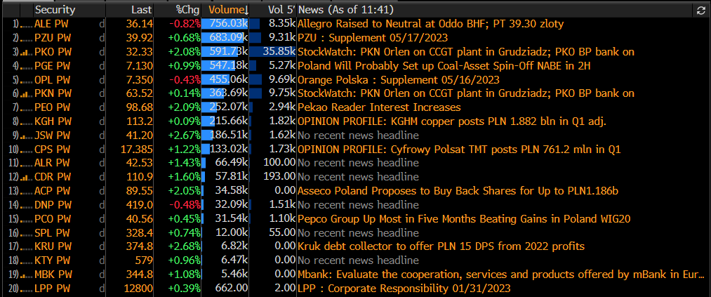 Najaktywniejsze walory z benchmarku WIG20. Wzrosty koryguje Allegro (ALE.PL) mimo ostatniego podniesienia rekomendacji przez Oddo BHF. Źródło: Bloomberg