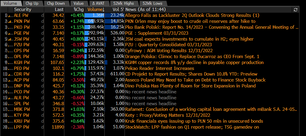 Główne informacje nt. spółek z polskiego parkietu. Źródło: Bloomberg