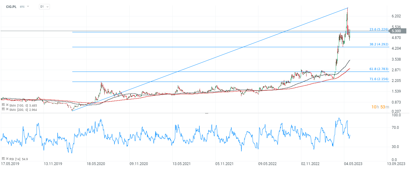 Akcje CIGames (CIG.PL), interwał D1. Po euforycznych wzrostach korekta cofnęła walory w okolice 23,6 zniesienia Fibonacciego fali wzrostowej z kwietnia 2020 roku. Źródło: xStation5