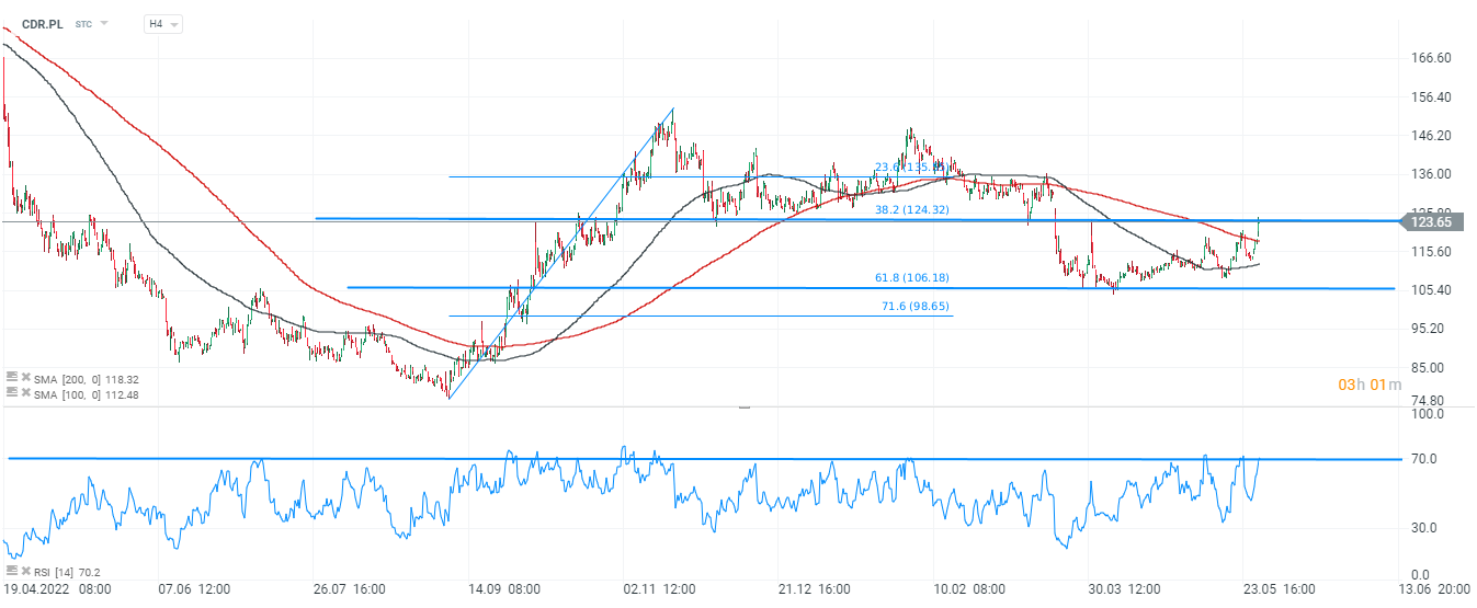 Akcje CD Projekt (CDR.PL), interwał H4. Walory spółki zyskują na dzisiejszej sesji, przed wynikami finansowymu niemal 4% i próbują wybić się powyżej górnego ograniczenia struktury cenowej, w okolicach 38,2 zniesienia Fibonacciego fali wzrostowej z jesieni 2022 roku, przy 124 PLN. Jej dolne ograniczenie stanowi z kolei poziom 106 PLN, gdzie widzimy 61,8 zniesienie Fibonacciego. Cena pokonała opór przy SMA200 (czerwona linia) jednak RSI pokonało poziom 70 pkt, gdzie w przeszłości często uruchamiała siępodaż. Źródło: xStation5