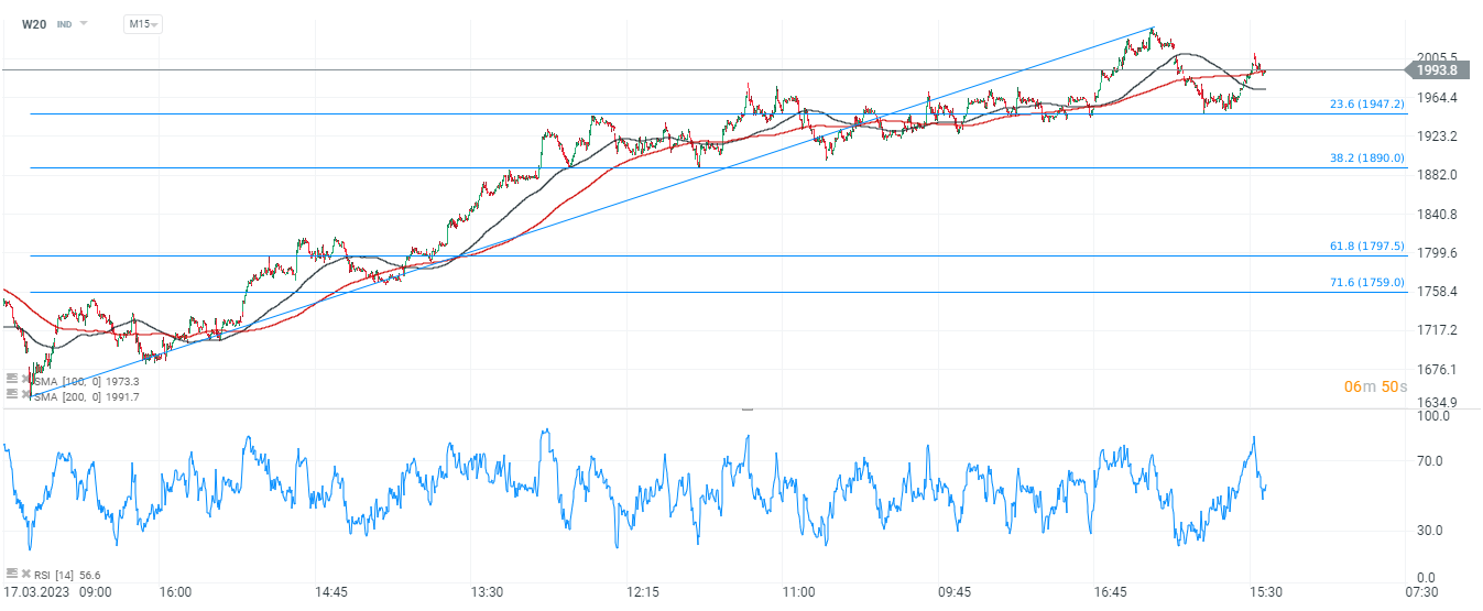 Wykres notowań kontraktów opartych o indeks WIG20 (W20), interwał M15. Wskaźnik siły względnej (RSI) jest wciąż bliski neutralnych poziomów po tym jak byki nie zdołały trwale pokonać 2000 pkt. Cena osunęła się poniżej SMA200 (czerwona linia). ). Kluczowego wsparcia możęmy szukać na poziomie 1950 pkt, gdzie widzimy 23,6 zniesienie Fibonacciego fali wzrostowej z marca 2023 roku. Źródło: xStation5