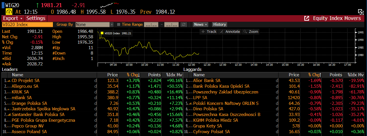 Najaktywniejsze walory z benchmarku WIG20. Zdecydowanie najlepiej wypadają dziś walory CD Projekt (CDR.PL) oraz Allegro (ALE.PL).
