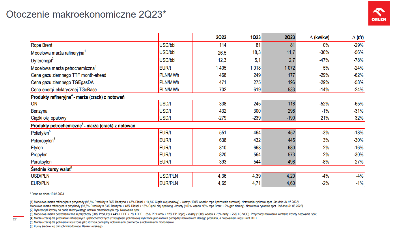 PKN Orlen szacuje, że kurs ropy Brent spadnie do rejonu 85-95 USD za baryłkę. Marże rafineryjne mają spaść do 11 dolarów, a marża petrochemiczna do 1,1 tysięcy euro za tonę. Jako przyczynę spółka wskazała spowolnienie gospodarcze. Źródło: PKN Orlen