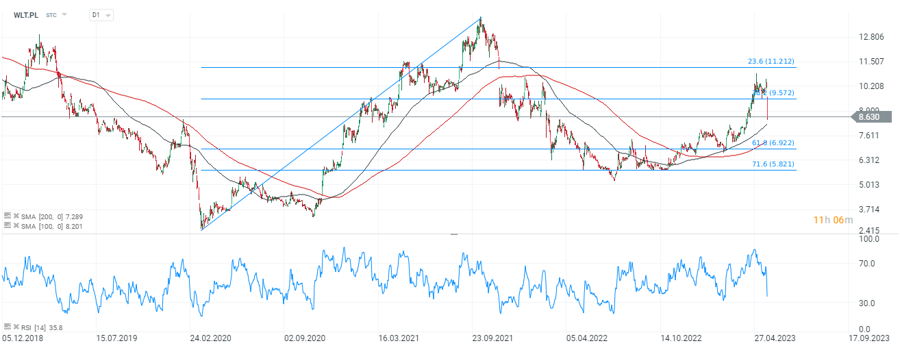 Akcje Wielton (WLT.PL) notują dziś potężną wyprzedaż. Kluczowym poziomem wsparcia może okazać się dopiero poziom między 6,90 PLN a 7,30 PLN za walor gdzie widzimy 61,8 zniesienie Fibonacciego i SMA200 (czerwona linia). Zniesienie przy 38,2 Fibo zostało złamane przez falę spadkową. Źródło: xStation5