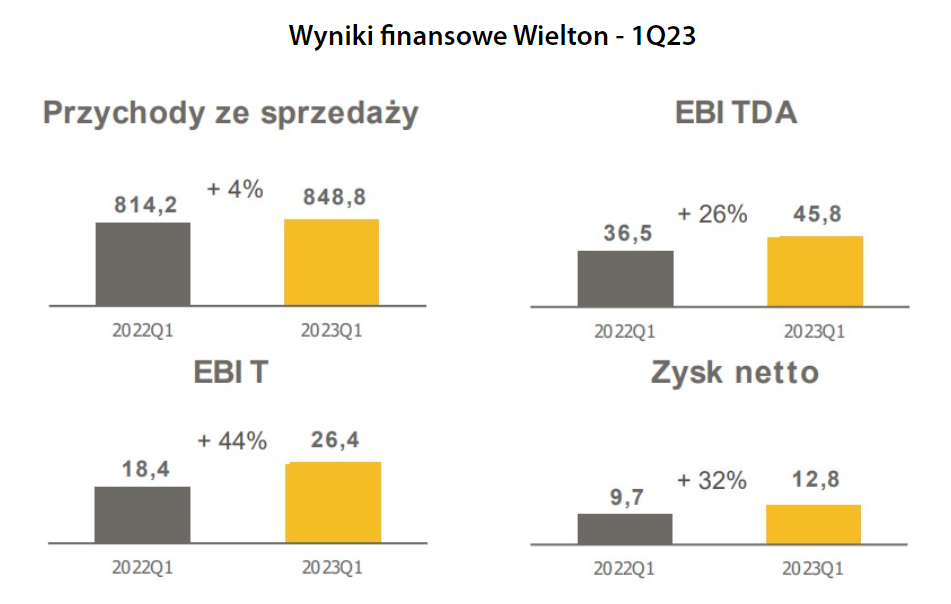 Wyniki Wielton (WLT.PL), spółka jest jednym z największych producentów naczep w Europie toteż jego wyniki finansowe mogą być ściśle zależne od bieżącej koniunktury gospodarczej (spedycja, rolnictwo). Raport za I kw. negatywnie zaskoczył inwestorów, a akcje notują niemal 17% przecenę. Marża netto spółki w I kw. stopniała do 1,3% wobec 3,3% prognoz i mimo nieznacznie wyższych od oczekiwań przychodów zysk netto wyniósł 13,7 mln zł wobec 29 mln zł oczekiwanego (!). Wyniki pokazały, że potencjalna recesja może mocniej uderzyć w marżowość spółki przez co akcje notują dziś potężne spadki. Z drugiej strony fundamentalnej spółka stała się bardziej atrakcyjna.