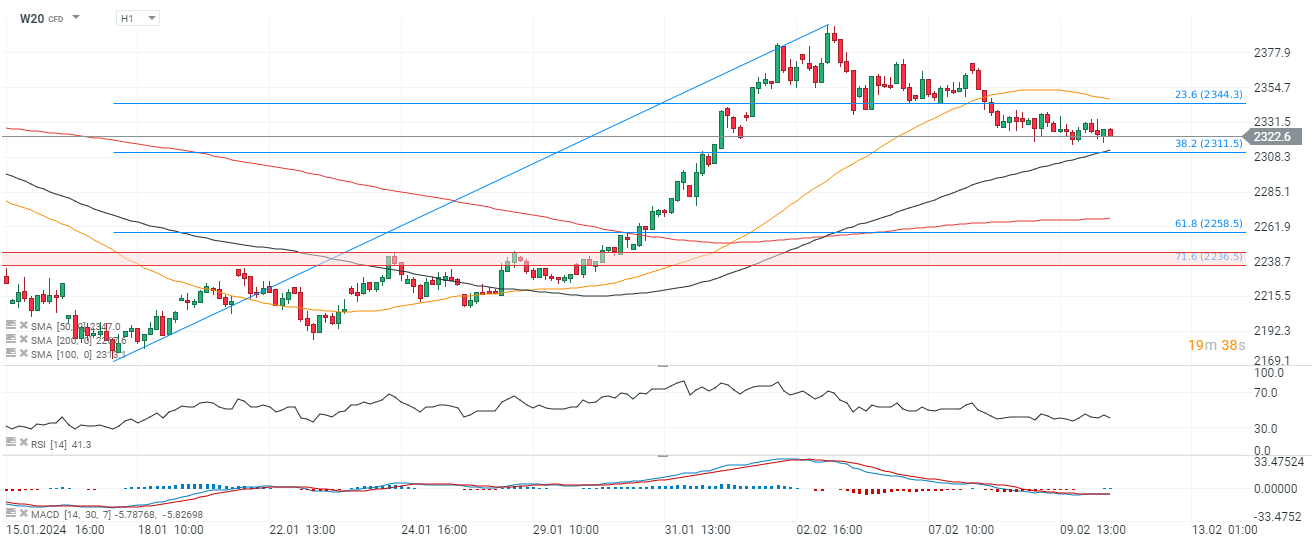 Patrząc na momentum W20, widzimy, że to zdecydowanie wyhamowało i niewykluczona jest dalsza konsolidacja między 23,6 a 38,2 zniesieniem Fibonacciego (2300 - 2350 punktów), w oczekiwaniu na katalizator. W scenariuszu spadkowym główne wsparcie znajduje się w okolicach 2250 punktów i stanowi je średnia SMA200 na interwale godzinowym (do 2022 bezbłędnie 'oddzielająca' wzrosty od korekt) oraz 71,6 zniesienie Fibonacciego, wsparte dodatkowo poprzednimi reakcjami cenowymi (trzy lokalne szczyty, w styczniowej konsolidacji).
