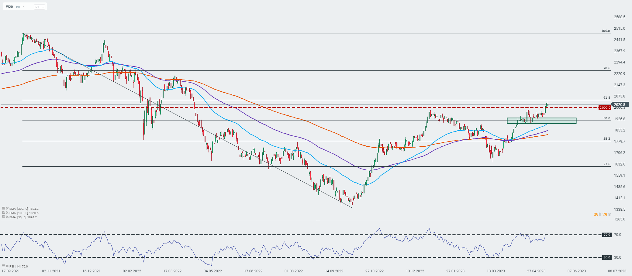 Wykres notowań kontraktów opartych o indeks WIG20 (W20), interwał D1. Benchmark największych w Polsce spółek giełdowych redukuje część zysków z początku sesji. Kluczowym punktem do obserwacji w chwili obecnej jest strefa blisko 2000 punktów, która stanowi średnioterminowy ważny punkt wsparcia. Źródło: xStation5