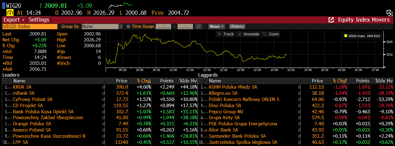 Najaktywniejsze walory z benchmarku WIG20. Na szczególną uwagę zasługuje w tym aspekcie KRUK (ALE.PL), którego akcje notują w chwili obecnej blisko 4% wzrosty. Źródło: Bloomberg