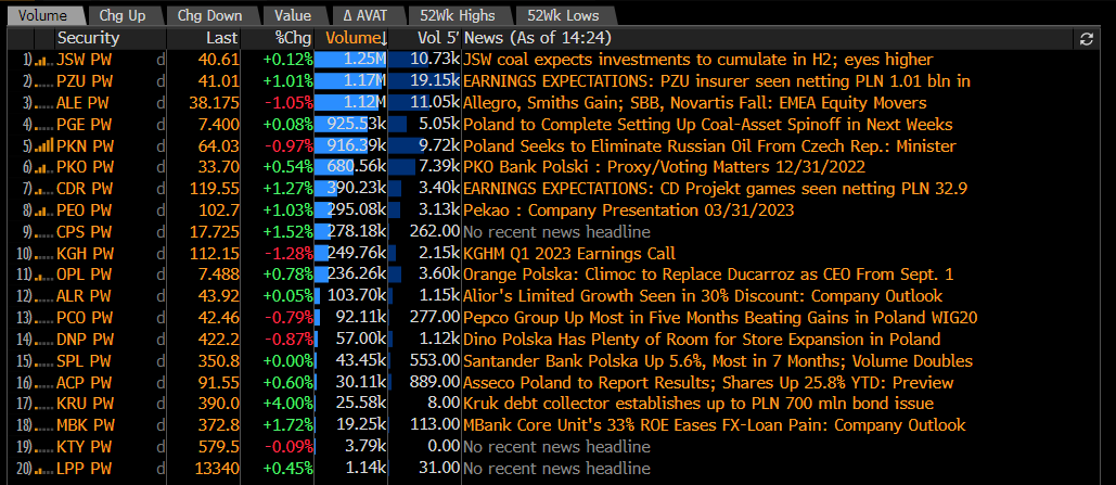 Główne informacje nt. spółek z polskiego parkietu. Źródło: Bloomberg