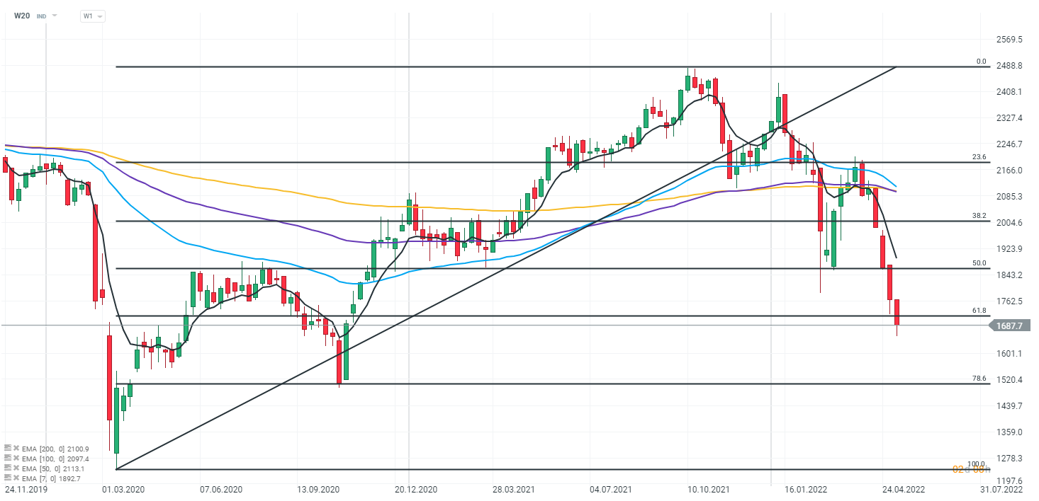 Wykres W20, interwał W1. Polski indeks blue chipów przebił się poniżej wsparcia wyznaczonego przez zniesienie 61,8% Fibo, fali wzrostowej po dołku covidowym z 2020 roku. W chwili obecnej indeks traci blisko 2%. Źródło: xStation 5