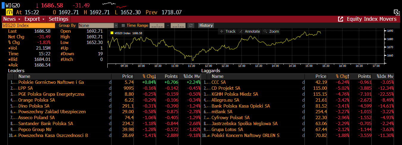 Spółki wchodzące w skład indeksu WIG20 (W20) i ich największe zmiany procentowe w ujęciu dziennym. Źródło: Bloomberg