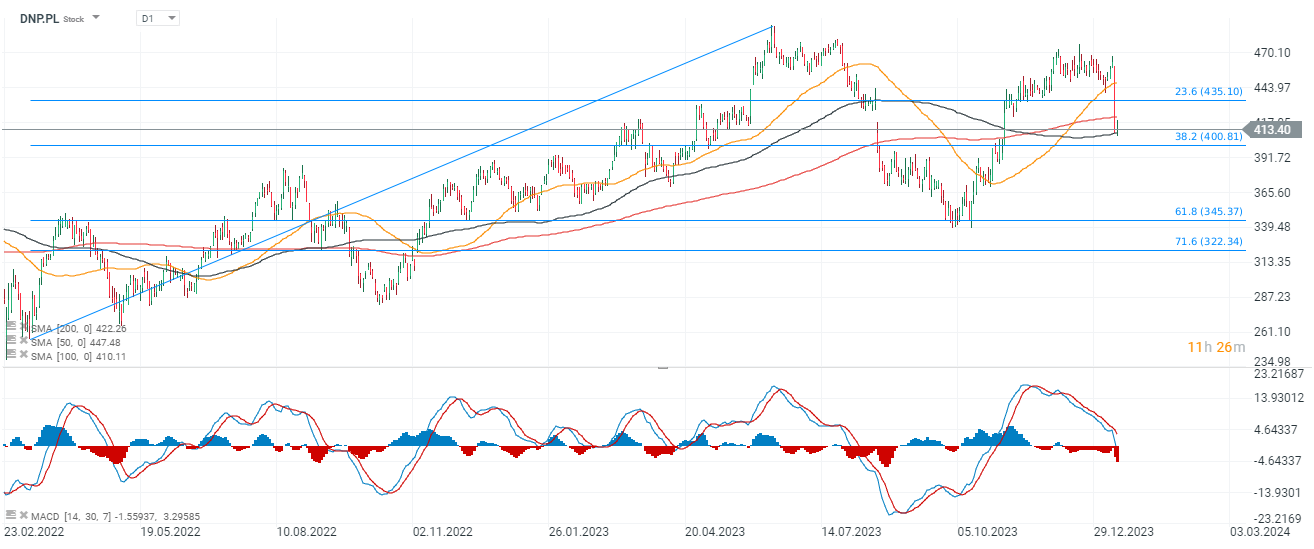 - Dino Polska (DNP.PL) zyskuje 1,3% po ostatnich wyprzedażach