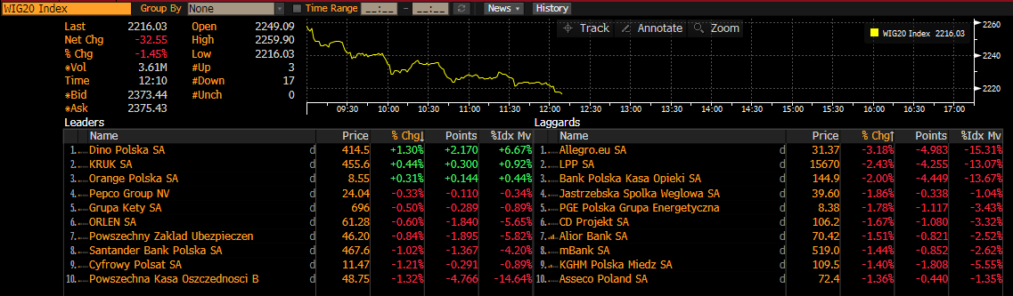 Najaktywniejsze walory z benchmarku WIG20. Widzimy niewielkie odbicie, po silnych spadkach na akcjach Dino Polska (DNP.PL) oraz realizację zysków na Allegro (ALE.PL) i LPP (LPP.PL). Źródło: Bloomberg Finance L.P.