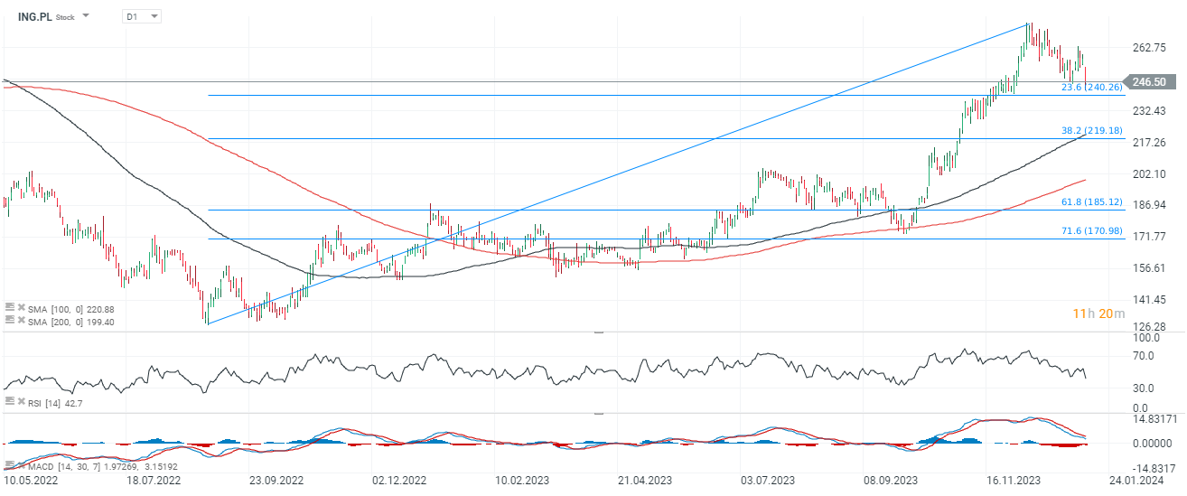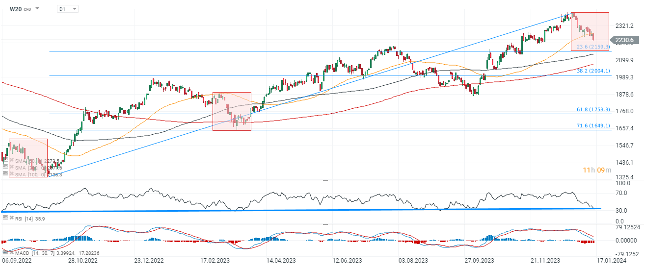 W20 w chwili obecnej traci 1,3% i jest dziś najsłabszym benchmarkiem w Europie. Patrząc jednak na notowania od jesieni 2022 roku, korekta potencjalnie może zatrzymać się w okolicach 2160 punktów, gdzie widzimy 23,6 zniesienie fali wzrostowej z jesieni 2022 roku, lokalne szczyty z lata 2023 oraz potencjalnie również ograniczenie geometrią rynku. Źródło: xStation5