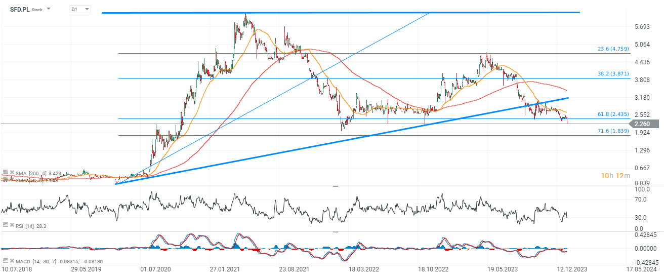 Akcje SFD (SFD.PL) notują dziś spadki po rozczarowującym miesięcznym raporcie spółki. Długoterminowa linia trendu została zachwiana jesienią 2023 roku.Spadek poniżej 61,8 zniesienia Fibonacciego przy 2,43 PLN wskazuje, że walory mogą szukać wsparcia na poziomie 71,6 zniesienia Fibonacciego, przy 1,84 PLN Źródło: xStation5