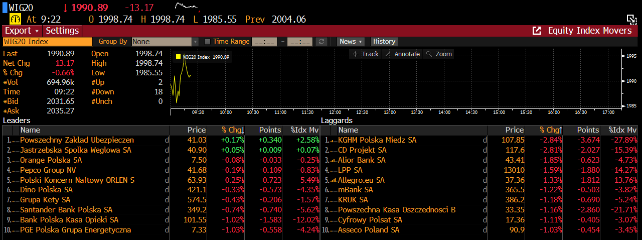 Główny polski benchmark został dziś zdecydowanie zdominowany przez sprzedających. Wyprzedaż rozlewa się także po wszystkich, większych europejskich benchmarkach. Największymi 'przegranymi' spośród spółek notowanych na WIG20 są CD Projekt, który napotkałwyraźne problemy by kontynuować wzrosty. Niedawno z krótką pozycją na akcjach CD Projektu ujawnił się fundusz BlackRock. Sentymentowi wokół KGHM ciąży w głównej mierzy kontynuacja spadków cen miedzi, spowodowana obawami o recesję.