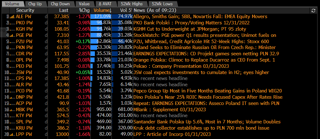 Najbardziej aktywne walory spośród WIG20. Źródło: Bloomberg