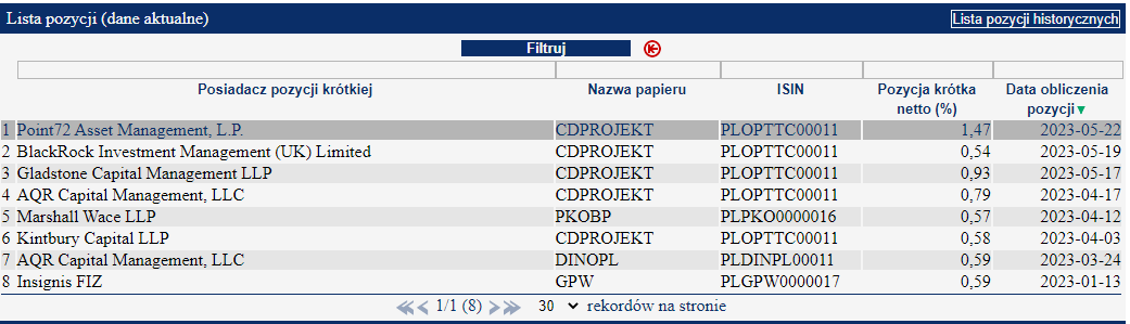 Rejestr pozycji krótkich. Łącznie 5 różnych funduszy gra na spadki cen akcji CD Projektu (CDR.PL). Źródło: KNF