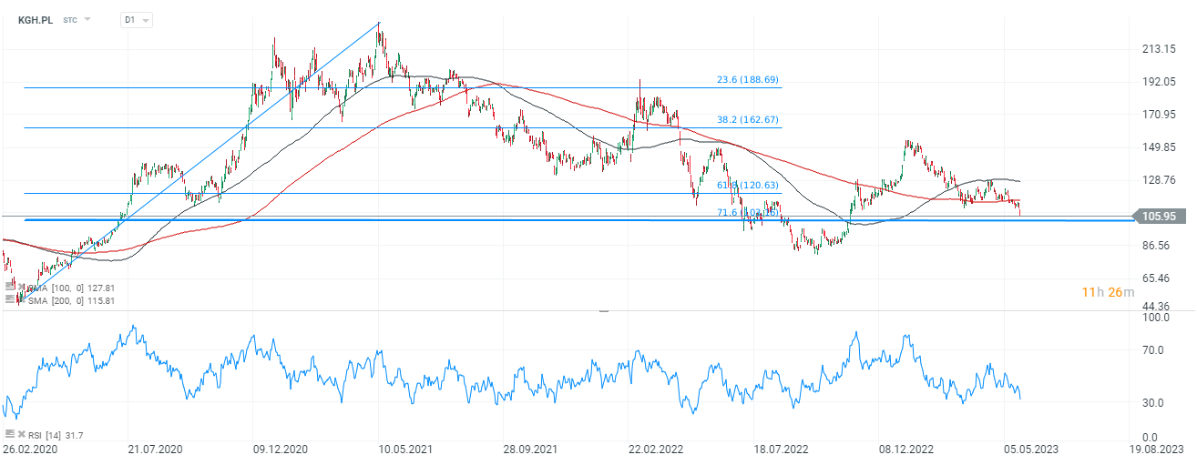 Akcje KGHM (KGH.PL), interwał D1. Cena walorów znajduje się wciąż 10% powyżej rekomendacji wydanej przez JP Morgan, istotnym poziomem od strony zniesień Fibonacciego może okazać się 71,6 zniesienie fali wzrostowej z marca 2020 roku w okolicach 102 PLN za walor. Źródło: xStation5