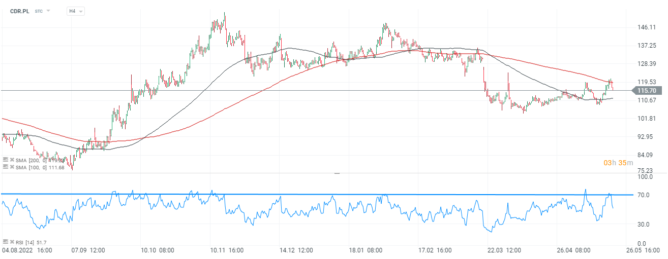 Akcje CD Projektu (CDR.PL), interwał H4. Walory CD Projektu tracą niemal 4,3%, wskaźnik RSI został dwukrotnie zepchnięty z poziomu 70 pkt. W przeszłości poziom ten wielokrotnie służył jako istotny wskaźnik 'przegrzania popytu'. Źródło: xStation5