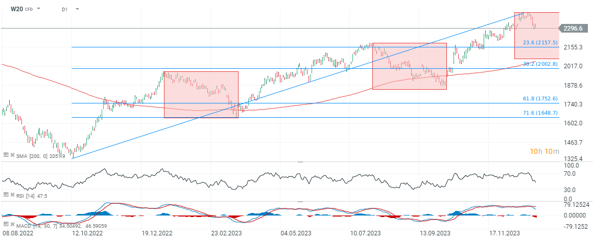 Patrząc na aktualne momentum W20, wydaje się, że byki mogą dążyć do przetestowania okolic SMA200 w średnim terminie (czerwona linia). Także patrząc na zasięg pozostałych dwóch, dużych korekt nie wykluczone, że jeśli geometria zostanie zachowana, indeks przetestuje okolice 2100 punktów, gdzie pojawić się może wyższa aktywność kupujących. Źródło: xStation5