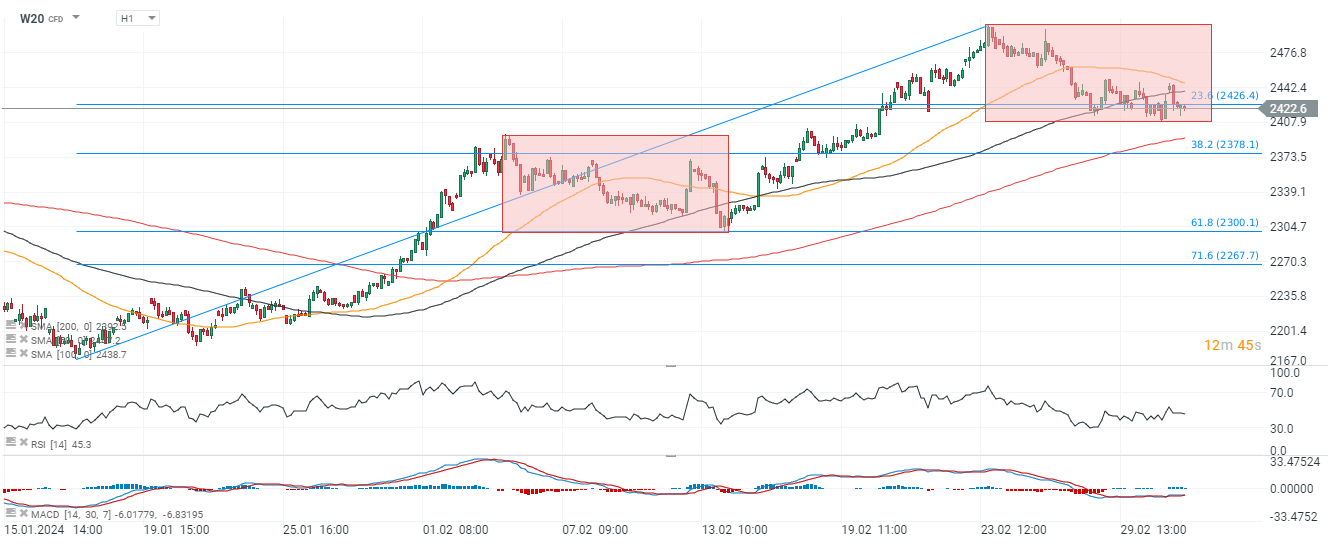 Kontrakty na WIG20 (W20) notują dziś ponad 1% spadki. Najważniejszym oporem pozostaje lokalny szczyt w okolicach 2500 punktów i niewykluczone, że jeśli indeks zrealizuje scenariusz korekty 1:1, byki znajdą siłę, by pchnąć benchmark w kierunku tych poziomów, w kolejnych tygodniach. Kluczowy będzie do tego jednak sentyment inwestorów globalnych. Źródło: xStation5