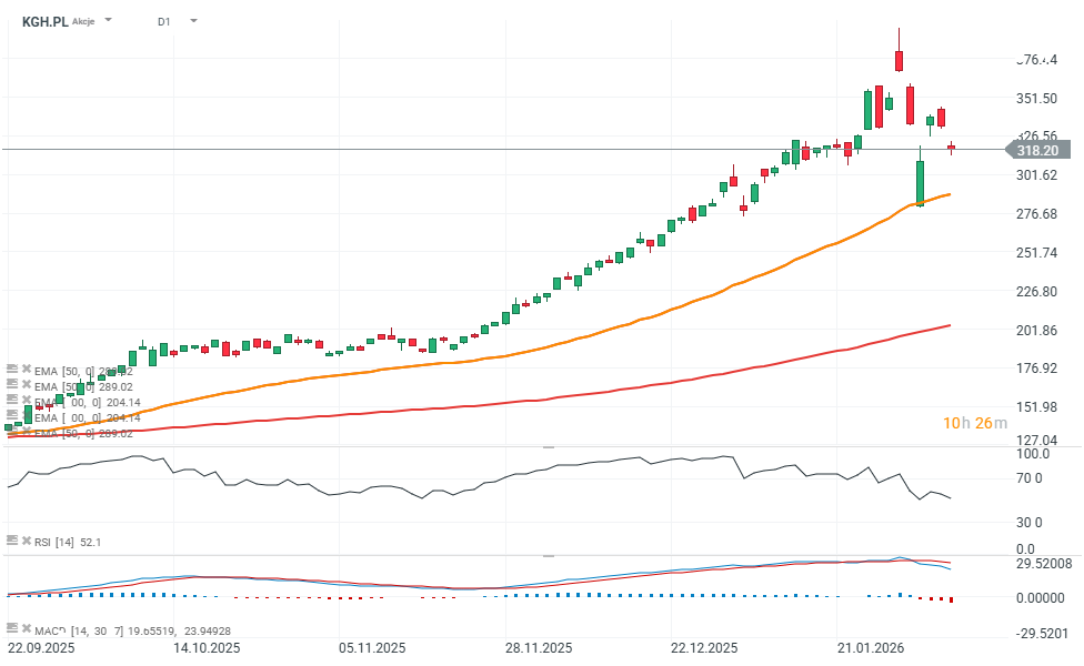 Akcje KGHM spadają dziś ponad 4% wobec wyprzedaży cen srebra, które odnotowało tąpnięcie poniżej 80 USD za uncję i nie zdołało utrzymać wzrostowej passy. Od trzech dni spadki kontynuuje także miedź, co finalnie musiało przełożyć się na sentyment wobec akcji polskeigo giganta wydobywczego.