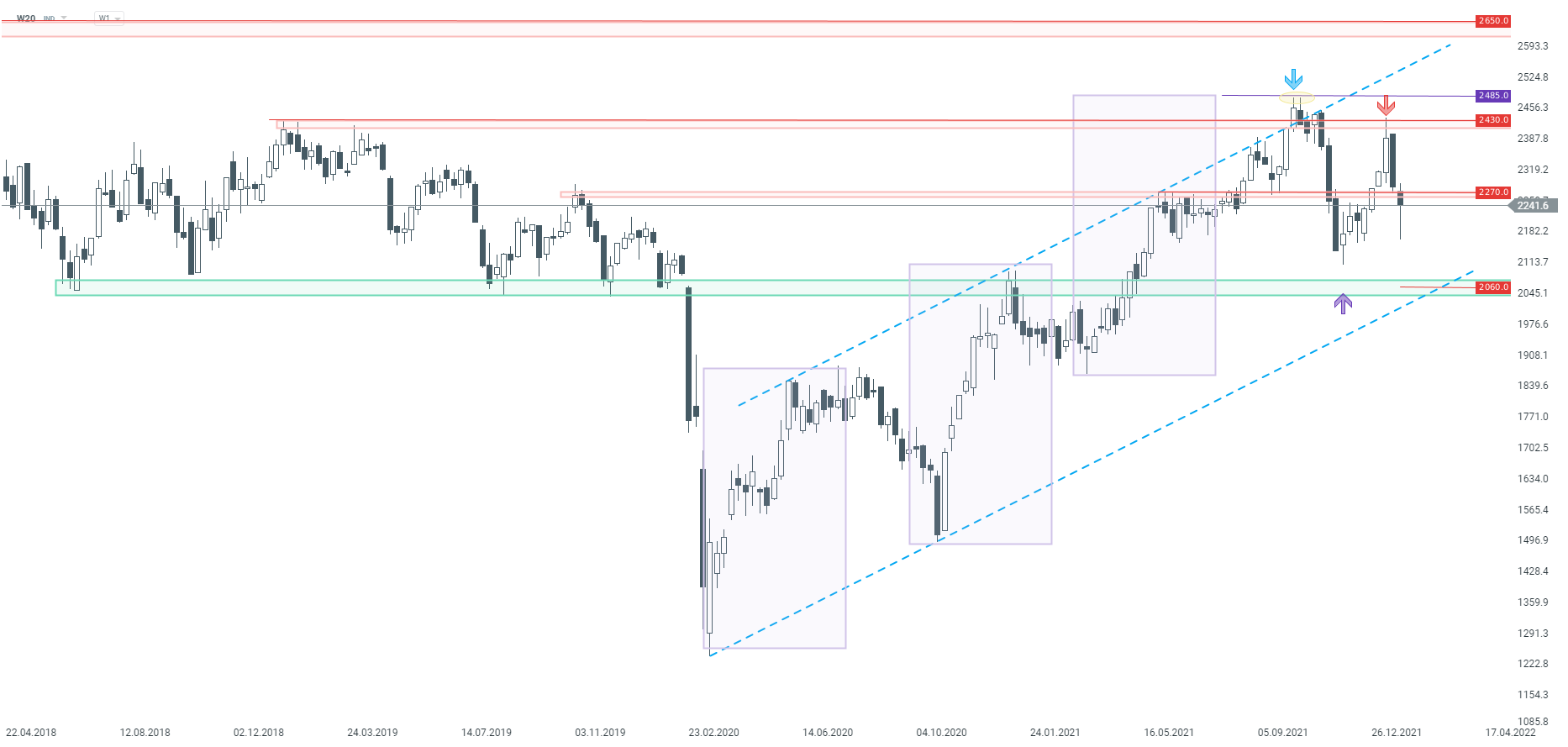Jeśli chodzi o sytuację techniczną na WIG20 (W20) na interwale W1, w minionym tygodniu doszło do odbicia od kluczowej strefy oporu przy 2430 pkt. Następnie kurs spadł także poniżej wsparcia przy 2270 pkt, co zgodnie z założeniami klasycznej analizy technicznej, otwiera drogę nawet w kierunku 2060 pkt. Niemniej na obecnej świecy W1 obserwujemy spory cień dolny, który jeśli zostanie utrzymany i notowania wrócą powyżej 2270 pkt, może dojść do ponownego przejęcia inicjatywy przez kupujących. Jednak do końca tygodnia jeszcze sporo czasu, a przed nami kluczowa decyzja Fed, dlatego wydaje się, że z oceną sytuacji będzie się trzeba wstrzymać do piątku.