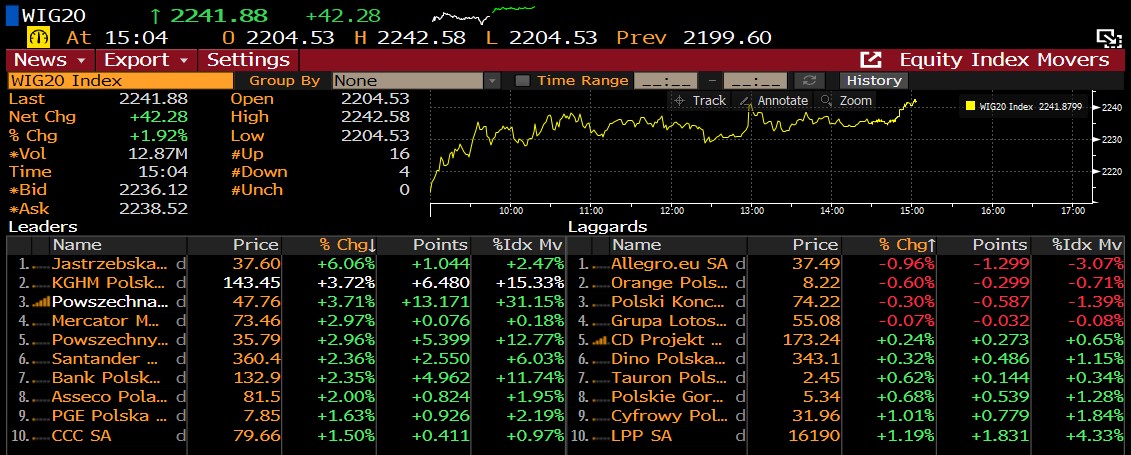 JSW (JSW.PL) jest obecnym liderem notowań polskich blue-chipów. Wspierającymi są rosnące wyceny kontraktów terminowych na węgiel oraz oświadczenie prezydenta Chin Xi Jinpinga, który zapewnił o zrównoważeniu celów klimatycznych ze strategią gospodarczą państwa.
