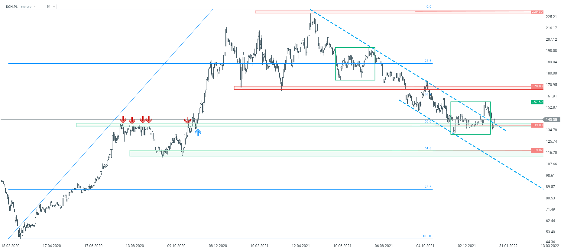Patrząc na notowania spółki KGHM (KGH.PL) na interwale D1, w ostatnim czasie mamy do czynienia ze sprzecznymi sygnałami. Z jednej strony, notowania od maja ubiegłego roku utrzymują się w tendencji spadkowej, a z drugiej sprzedający nie byli w stanie doprowadzić do trwałego pokonania wsparcia przy 139 zł. Aktualnie istnieje więc szansa na odreagowanie po ponad półrocznych spadkach, jednak aby mówić o większych wzrostach, krus musiałby w pierwszej kolejności pokonać opór przy 157,50 zł, gdzie znajduje się górne ograniczenie układu 1:1, a następnie strefę oporową przy 170 zł. Gdyby jednak wspomniana wcześniej strefa przy 139 zł została zanegowana, przecena mogłaby przybrać na sile, wtedy też kolejny ważny poziom to 119 zł. Źródło: xStation 5