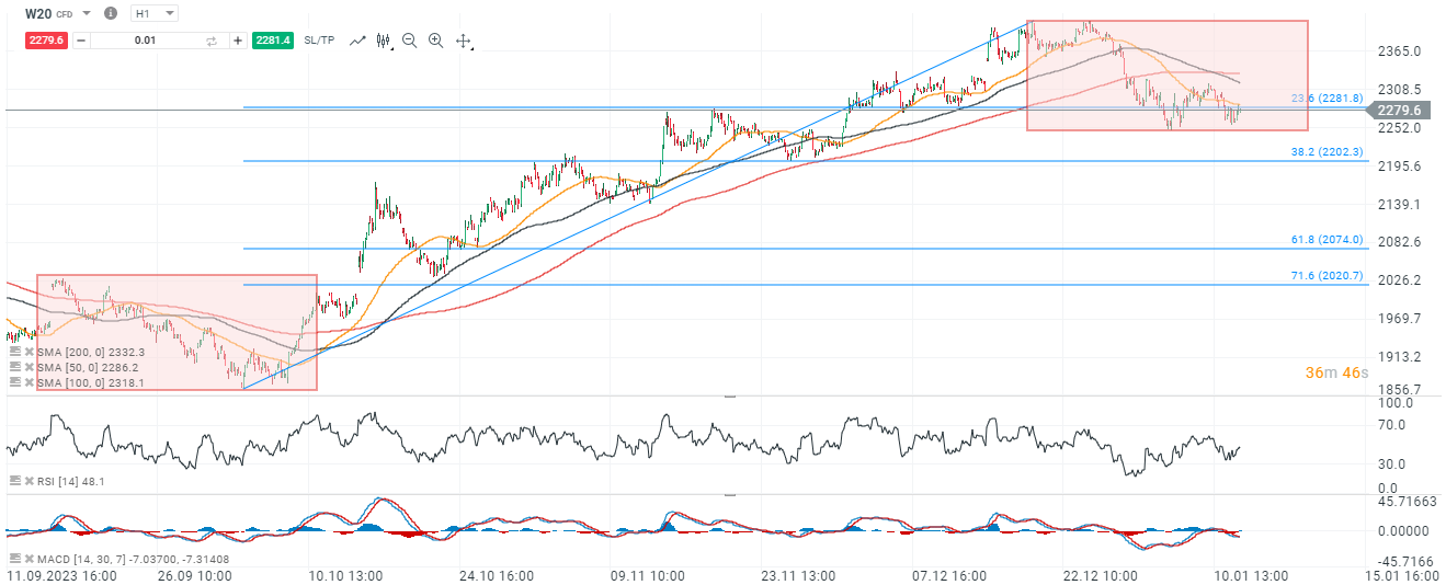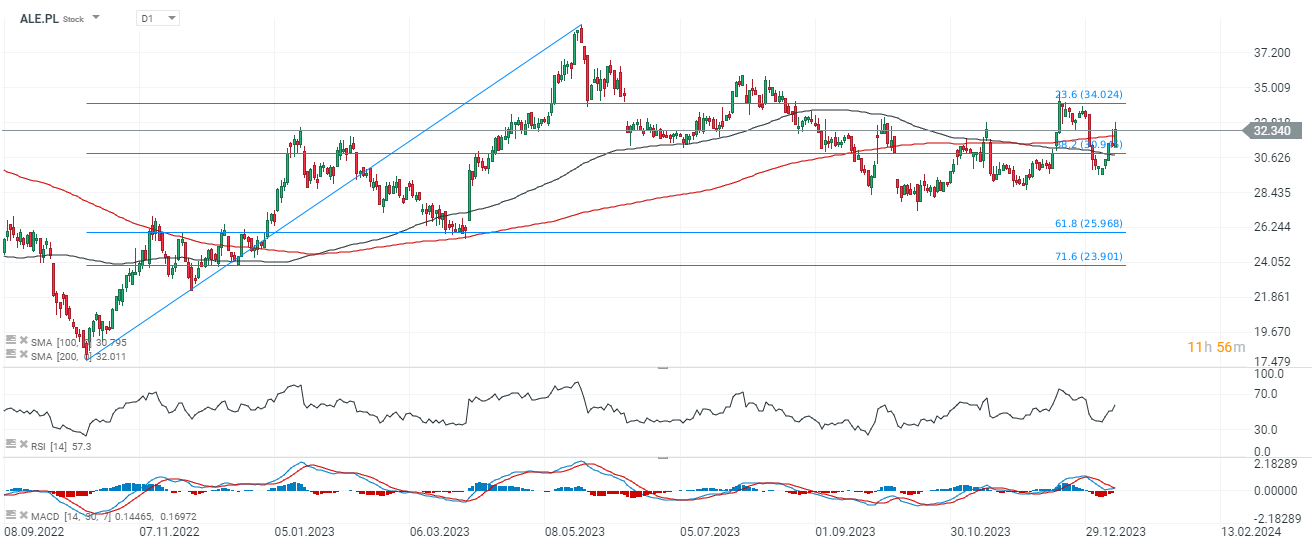 Allegro notuje dziś świetną sesję i odbija po spadkach z początku stycznia, gdy obawy napędzane były głównie przez kończący się okres 'lockup' i możliwą budowę przyspieszonej księgi popytu (ABB). Obawy te jednak nie zmaterializowały się dotychczas, a bardzo dobre wyniki InPostu sugerują, że także Allegro może pozytywnie zaskoczyć rynek. Połączenie obu tych czynników potencjalnie może otworzyć walorom drogę na wyższe poziomy, w okolicach 35 PLN. To właśnie tam obserwujemy silny poziom oporu wyznaczony przez 23,6 zniesienie Fibonacciego fali wzrostowej z 2022 roku oraz poprzednie reakcje cenowe (lokalne szczyty z przełomu listopada i grudnia). Przebicie się powyżej tej strefy może otworzyć walorom drogę do 40 PLN. Patrząc na MACD widzimy teoretycznie pozytywne dla dalszej akcji cenowej przecięcie średnich.
