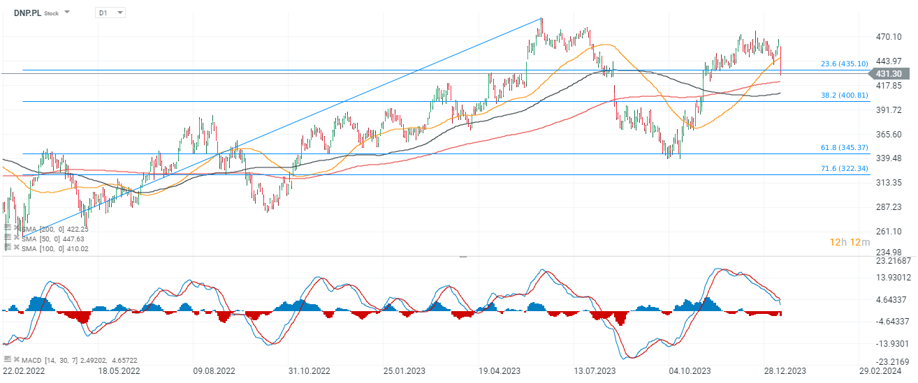 Przychody Biedronki w IV kwartale wzrosły o 17,2 proc. r/r do 5,69 mld euro, a w całym 2023 roku wzrosły rdr o 22,3 proc. do 21,5 mld euro. Właściciel Biedronki, Jeronimo Martins przekazał jednak, że sprzedaż denominowana w PLN wzrosła w IV kw. w ubiegłym roku o 9,4%, a wskaźnik porównywalny sprzedaży wzrósł o mniej więcej 5,1% wobec ponad 14% średniej dla całego 2023, co sugeruje spadkową dynamikę w ostatnim (teoretycznie) rekordowym kwartale. Stawia to spory znak zapytania nad wynikami i mnożnikową wyceną Dino, którego raport poznamy dopiero w marcu. Na razie nic nie zapowiada, by Dino miało odwrócić dziś przebieg najsłabszej sesji od sierpnia.
