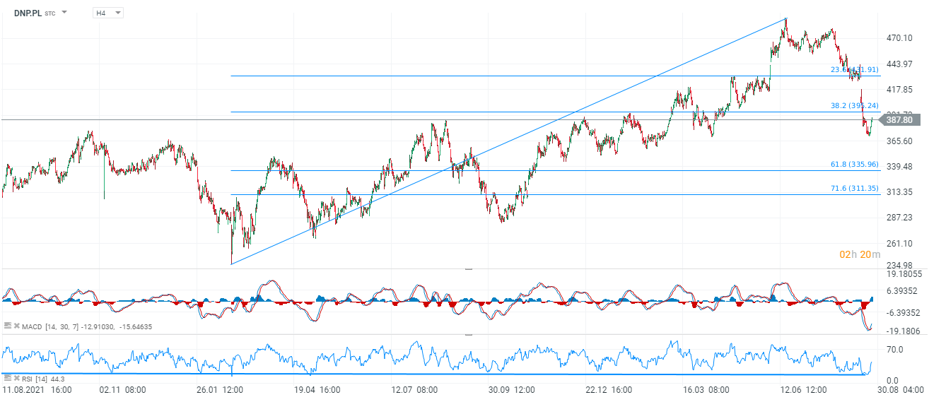 Akcje Dino Polska (DNP.PL), interwał H4. Głównym zadanie byków jest powrót powyżej 400 PLN za walor (psychologiczny poziom, 38,2 zniesienie Fibonacciego fali wzrostowej z 2022 roku. To mogłoby otworzyć drogę na poprzednie szczyty. Jeśli popyt pokaże słabość na obecnych poziomach prawdopodobny będzie retest nawet okolic 335 PLN za akcję (61,8 zniesienie Fibo) Źródło: xStation5