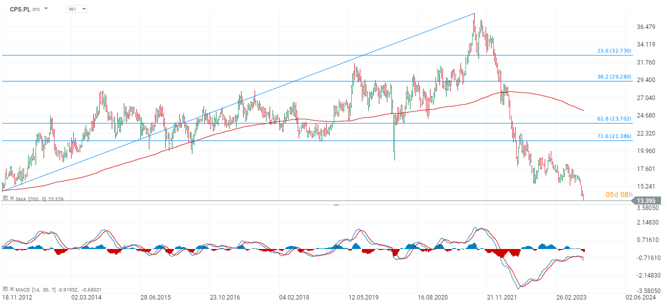 Akcje Cyfrowego Polsatu (CPS.PL) wymazały niemal 11 lat rozwoju firmy i pogłębiają spadki - znajdują się się obecnie na poziomach z 2012 roku. Źródło: xStation5