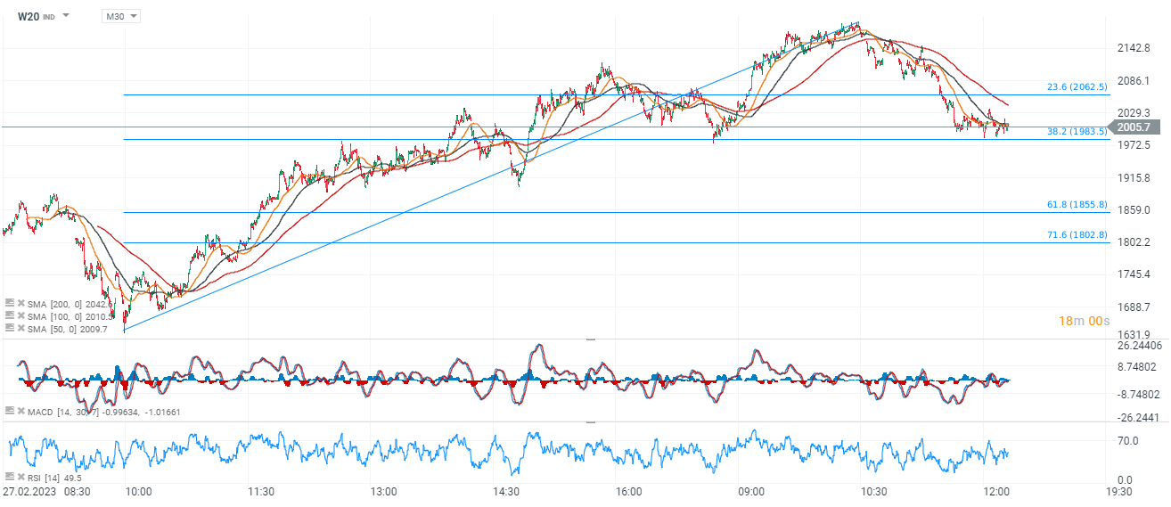W20 obronił się w strefie kluczowego wsparcia przy poziomie 2000 punktów i zdołał odbić od okolic 38,2 zniesienia Fibonacciego fali wzrostowej z marca. 2023. By utrzymać momentum byki powinny zdobyć się na retest 2060 pkt - gdzie widzimy 23,6 zniesienie. MACD i RSI odbijają się z niższych poziomów sygnalizując możliwe odreagowanie. Źródło: xStation5