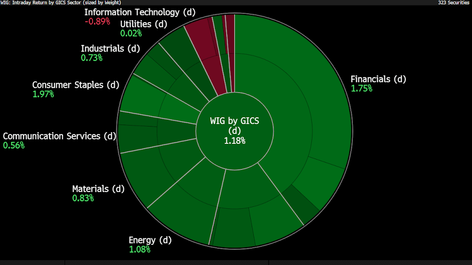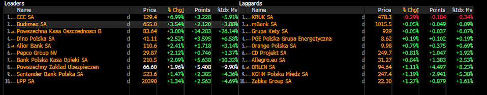 Dominacja dużych spółek sugeruje napływ kapitału zagranicznego, wspieranego przez mocnego złotego oraz oczekiwania na zakończenie wojny w Ukrainie. Największe wzrosty wśród blue chipów odnotowują CCC 6,99% i Budimex 3,54%. W górę idą także banki: PKO BP 3% i Pekao SA ponad 2%, a PZU zyskuje 1,9%.