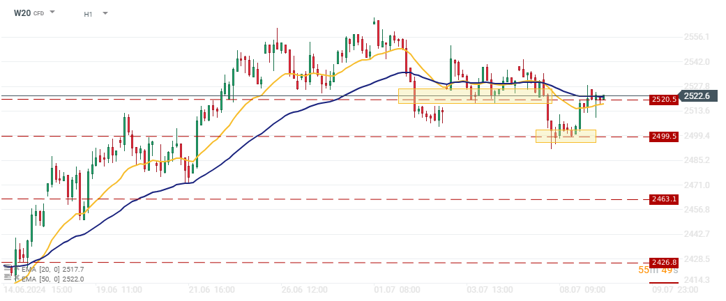 Kontrakt na indeks WIG20 (W20) w interwale 1H obronił strefę wsparcia w okolicy 2500 pkt i obecnie powrócił powyżej strefy 2520 pkt, która obecnie stanowi kluczową sferę determinującą dalszy kierunek sentymentu. Poprzedni tydzień przyniósł próbę utrzymania się notowań powyżej sfery i odbiciu w kierunku lokalnych szczytów wynoszących 2556 pkt. Jeżeli kontraktowi uda się obronić wsparcie i utrzymać się powyżej 2522 pkt. byki mogą spodziewać się przejęcia kontroli oraz dostrzec kolejne impulsy wzrostowe. Jeżeli kontrakt wróci do wartości poniżej 2522 pkt, po przebiciu 2500 pkt następnym istotnym poziomem jest 2463 pkt. Źródło: xStation