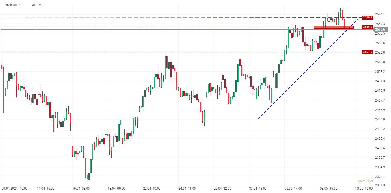 Kontrakt na indeks WIG20 (W20) w interwale 1H notuje lekką korektę po wybiciu w trakcie wczorajszej sesji nowych szczytów. Spadek znajduje się w ograniczeniu krótkoterminowego trendu wzrostowego z początku tego tygodnia, jednak najprawdopodobniej strona popytowa nie będzie dzisiaj wystarczająco silna, aby utrzymać wzrosty w ramach kanału. Wciąż czekamy na umocnienie przebicia wsparcia ze szczytów z 6.05. Jeżeli kurs jednak się odwróci, możemy spodziewać się kierunku w stronę oporu z obszaru wczorajszej konsolidacji na poziomie ok. 2570,7 pkt. Źródło: xStation