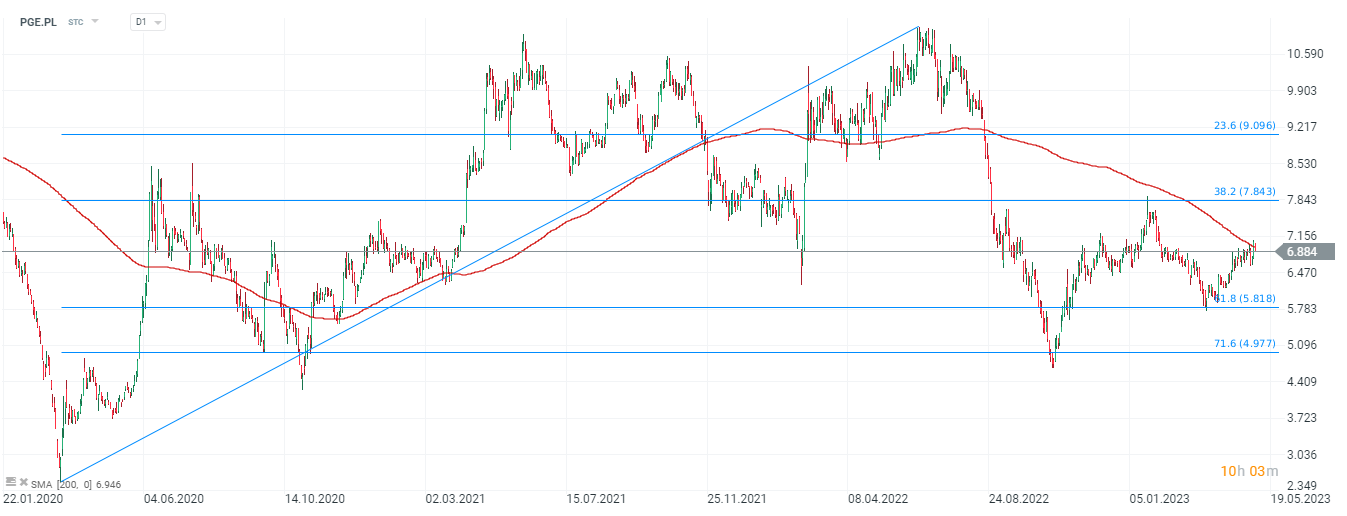 Akcje PGE (PGE.PL) są obecnie najsłabiej radzącym sobie walorem z WIG20. Sprzedaż uaktywniła się po tym jak cena dotarła do SMA200, na interwale D1. Pokazuje to, że reakcje w najbliższych dniach mogą być kluczowe dla dalszego rozwoju trendu. Jeśli ruch spadkowy zostanie wznowiony, cena może przetestować 5,8 PLN - poziomy wyznaczone przeszłymi reakcjami cenowymi oraz 61,8 zniesieniem Fibonacciego fali wzrostowej z marca 2020 roku. Źródło: xStation5