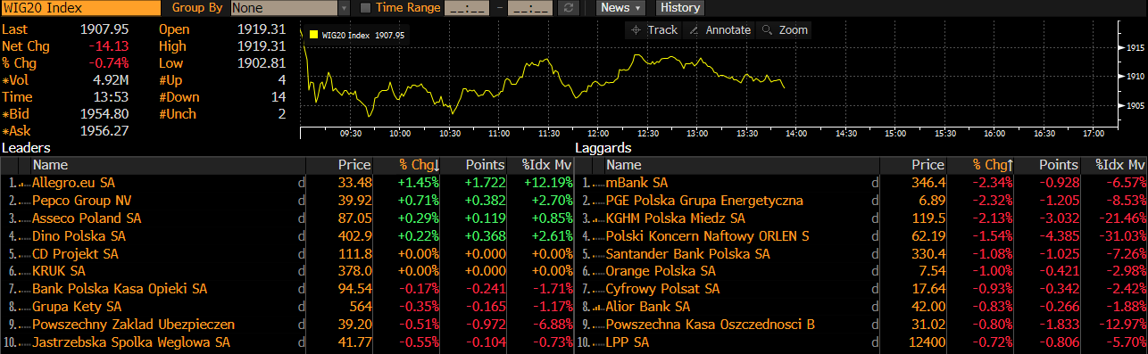 Najbardziej aktywne spółki z indeksu WIG20. Najsłabiej radzą sobie mBank, PGE oraz KGHM, który redukuje wczorajsze wzrosty. Źródło: Bloomberg
