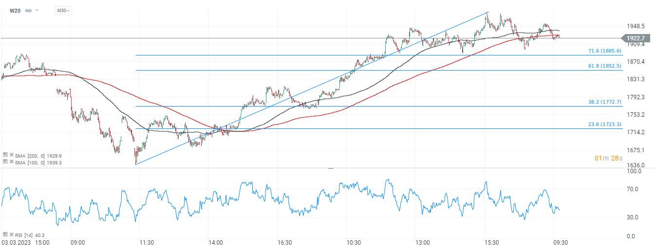Wykres W20, interwał M30. Kontrakty na główny, polski benchmark osunęły się poniże jSMA200 na interwale M30, co ostatnio miało miejsce na początku maja - wówczas byki szybko zdołaly odrobić straty. Ponowy spadek poniżej SMA200 na przestrzeni kilku dni może sugerować jednak, że argumenty kupujących chwilowo się wyczerpały przez co dojść do glosu może strona podażowa. Pierwszego wsparcia można szukać na poziomie 1880 pkt, gdzie widzimy 23,6 zniesienie Fibonacciego fali wzrostowej z drugiej połowy marca. Źródło: xStation5