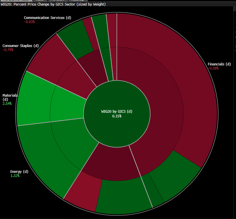 W czwartek na warszawskim parkiecie panuje mieszany sentyment. Na parę minut przed godziną 12 indeks WIG20 zyskuje 0,5%, zbliżając się do poziomu 3000 punktów, jednak wzrost jest wyraźnie słabszy niż w poprzednich dniach. Wzrosty wspierają przede wszystkim spółki energetyczne i surowcowe, choć nieco mniejsze zainteresowanie wykazują średnie i małe firmy. Indeks mWIG40 notuje niemal stabilny poziom 0,05%, a sWIG80 lekko się cofa o 0,05%, co sugeruje ostrożność inwestorów wobec segmentu średnich i małych przedsiębiorstw. Ogólnie rynek utrzymuje umiarkowanie pozytywny nastrój, jednak dynamika wzrostów wyraźnie osłabła w porównaniu do wcześniejszych sesji.