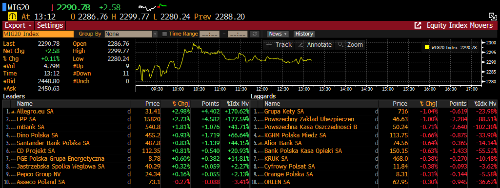 Najmocniejsze wzrosty spośród WIG20 notuje dziś Allegro i LPP. Ponad 1% tracą Grupa Kęty (KTY.PL) i PZU (PZU.PL). Źródło: Bloomberg Finance LP