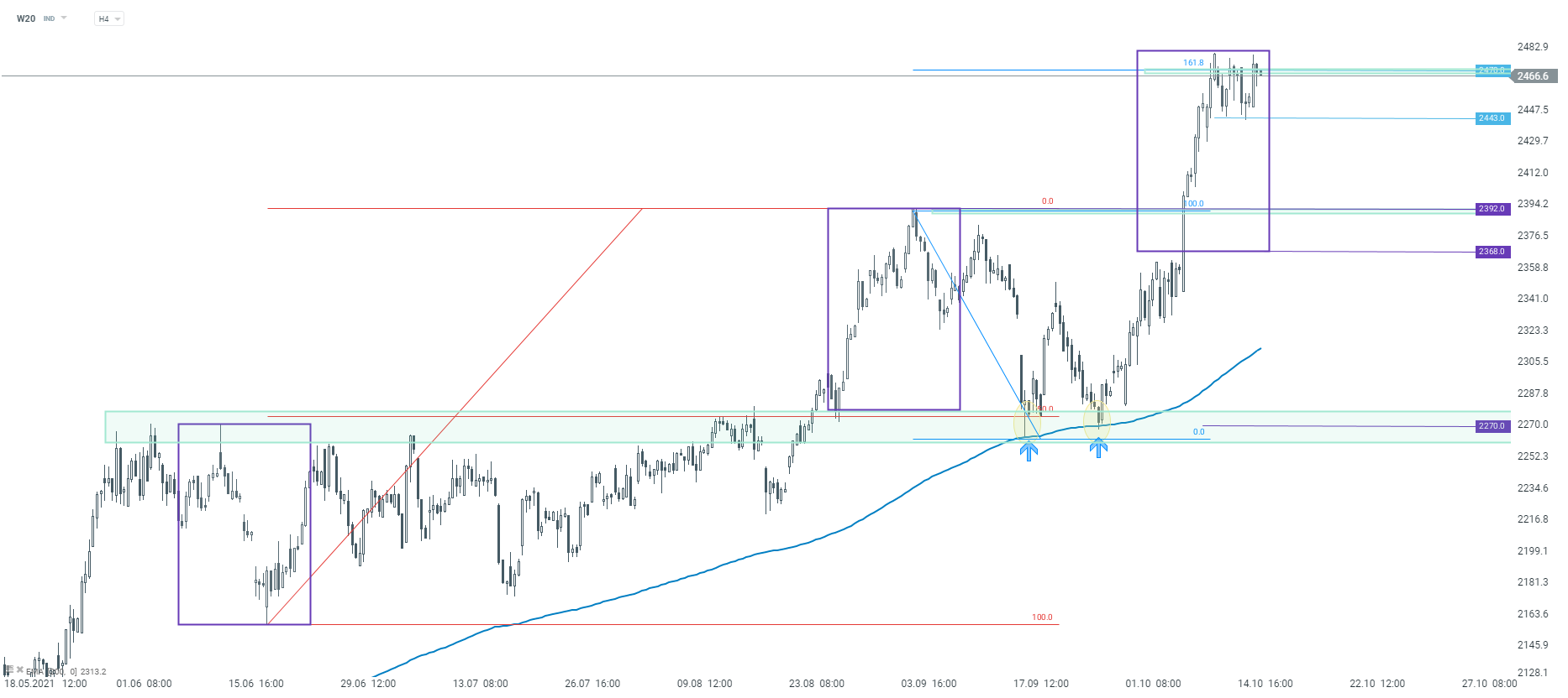 Jeśli chodzi natomiast o sytuację na wykresie WIG20 (W20), notowania znajdują się dziś w rejonach tegorocznych maksimów. Okolice poziomu 2470 pkt pozostają istotne w krótkim terminie. Miejsce to wynika z mierzenia zewnętrznego 161,8% Fibonacciego. Niemniej aby myśleć o większej korekcie spadkowej, musiałoby dojść do pokonania wsparcia przy 2443 pkt. Wtedy też mógłby się uruchomić ruch w kierunku wsparcia przy 2392 pkt, bądź 2368 pkt. Na razie jednak na wykresie nie ma sygnałów sugerujących odwrócenie trendu wzrostowego.