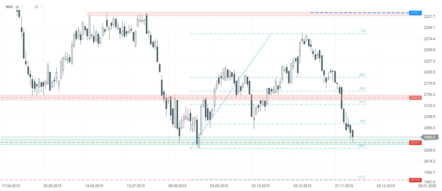 Zła passa nie opuszcza polskiej giełdy. W ujęciu rocznym WIG20 znajduje się blisko 9% pod kreską, z kolei dziś spadki wynoszą 0,5%. Patrząc na wykres W20, notowania dotarły do kluczowego poziomu wsparcia. W tym miejscu reakcje popytowe pojawiały się już kila razy, między innymi w sierpniu tego roku, ale także lipcu 2018 r. Jest to na pewno ciekawy poziom do wykonania korekty wzrostowej, niemniej trzeba pamiętać o zachowaniu ostrożności. Jeżeli doszłoby do wybicia dołem, ruch spadkowy może przyspieszyć. Wtedy też jako kolejne wsparcie należy wziąć pod uwagę poziom 1975 pkt, gdzie znajduje się mierzenie zewnętrzne 127,2% FIbonacciego.