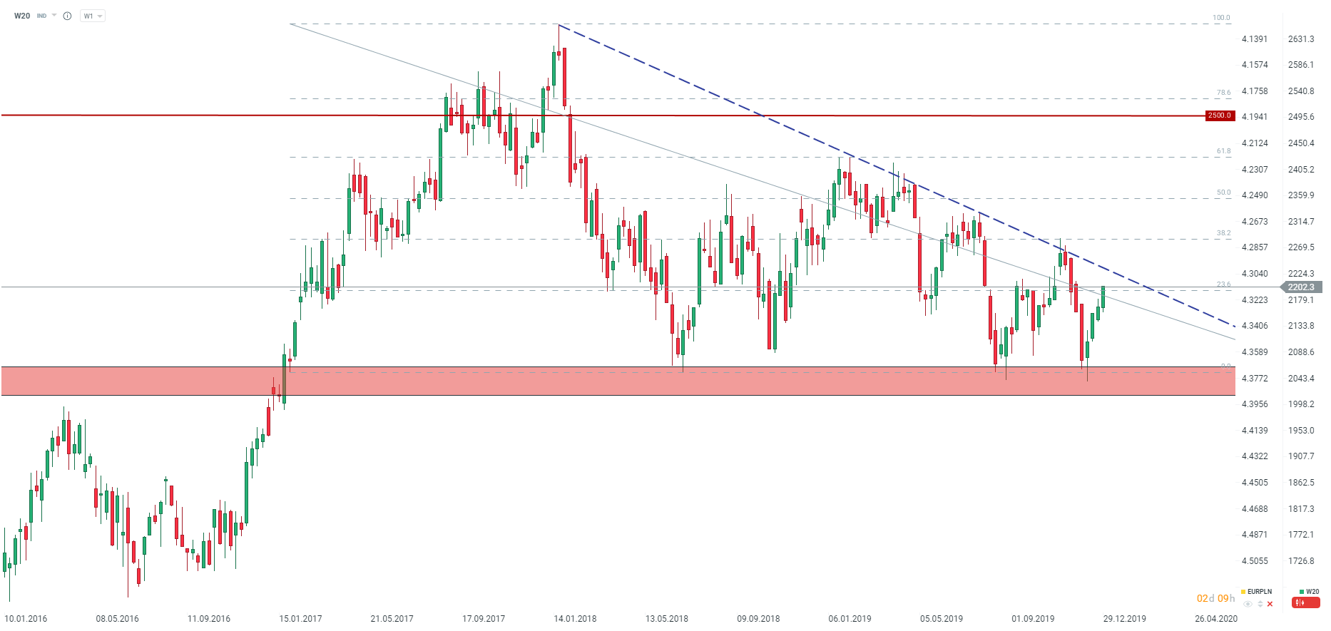 Indeks WIG20 kontynuuje w tym tygodniu bardzo silne wzrosty i szykuje się czwarte z rzędu zakończenie tygodnia na plusie. Wcześniej, w drugim tygodniu grudnia doszło do silnego odbicia z okolic 2 letnich minimów, tuż powyżej 2000 punktów. Aktualnie cena przebiła się przez opór w postaci zniesienia 23.6 fali spadkowej z 2018 roku. Przed indeksem pierwszy ważny opór w postaci spadkowej linii trendu. Następnym oporem byłyby lokalne szczyty przy zniesieniu 38.2 Oprócz tego warto zwrócić uwagę wciąż na ogromną dywergencję, która ma miejsce między indeksem WIG20, a światowym benchmarkiem dla indeksów EM, czyli MSCI EM.