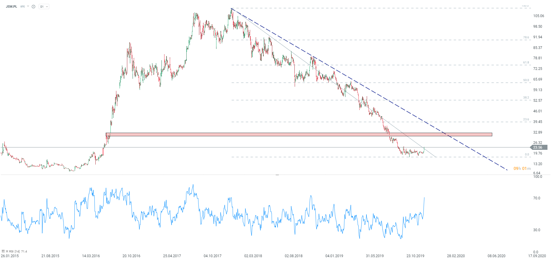 Akcje JSW napędzane są dzisiaj informacjami płynącymi z Chin. Wolumen transakcyjny jest dzisiaj 4 krotnie większy niż średni z poprzednich 20 sesji. Jak widać jednak akcje JSW szorowały w ostatnich tygodniach “po dnie”. Kolejny ważny opór znajduje się dopiero w okolicach 32 PLN za akcję, a następnie przy linii trendu spadkowego. Źródło: xStation5